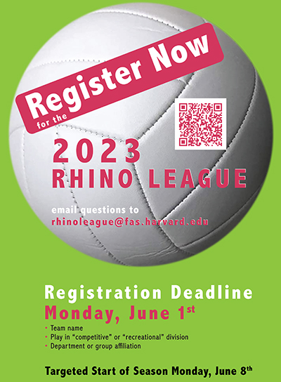 The sign-up sheet for 2023 Rhino League is here.Teams should register by June 1st to allow time for setting the league schedule. Questions can be directed to rhinoleague@fas.harvard.edu. Rhino League games are projected to start by June 8th. We hope to see everyone come out, either as players or supporters.